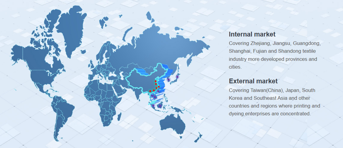 After years of development, our company has built a marketing network covering key domestic and foreign markets. In the domestic market, our customers have covered Taiwan, Zhejiang, Jiangsu, Guangdong, Shanghai, Fujian and Shandong provinces and cities with more developed textile industries; in overseas markets, our customers cover Japan, South Korea and Southeast Asia and other countries and regions where printing and dyeing enterprises are more concentrated.